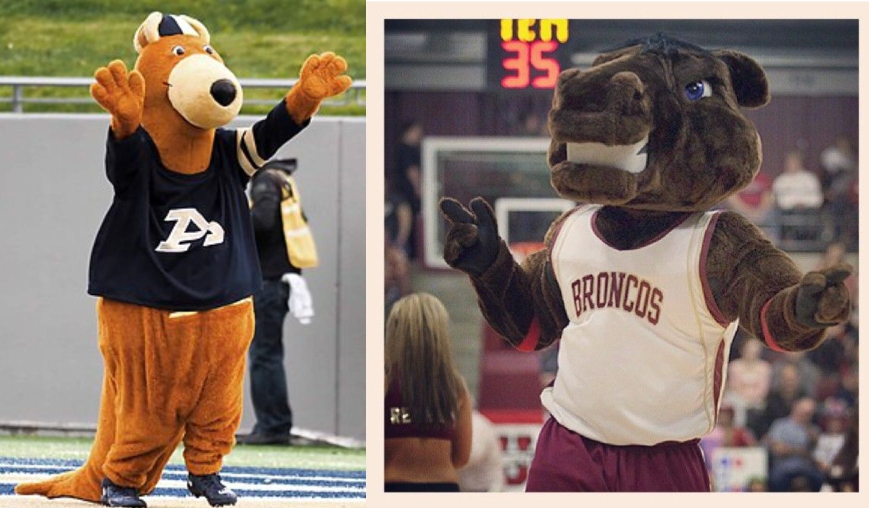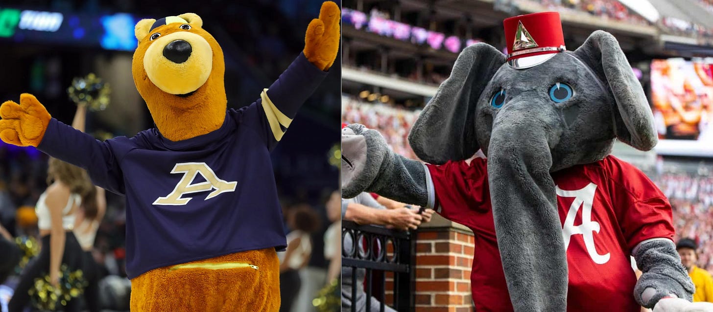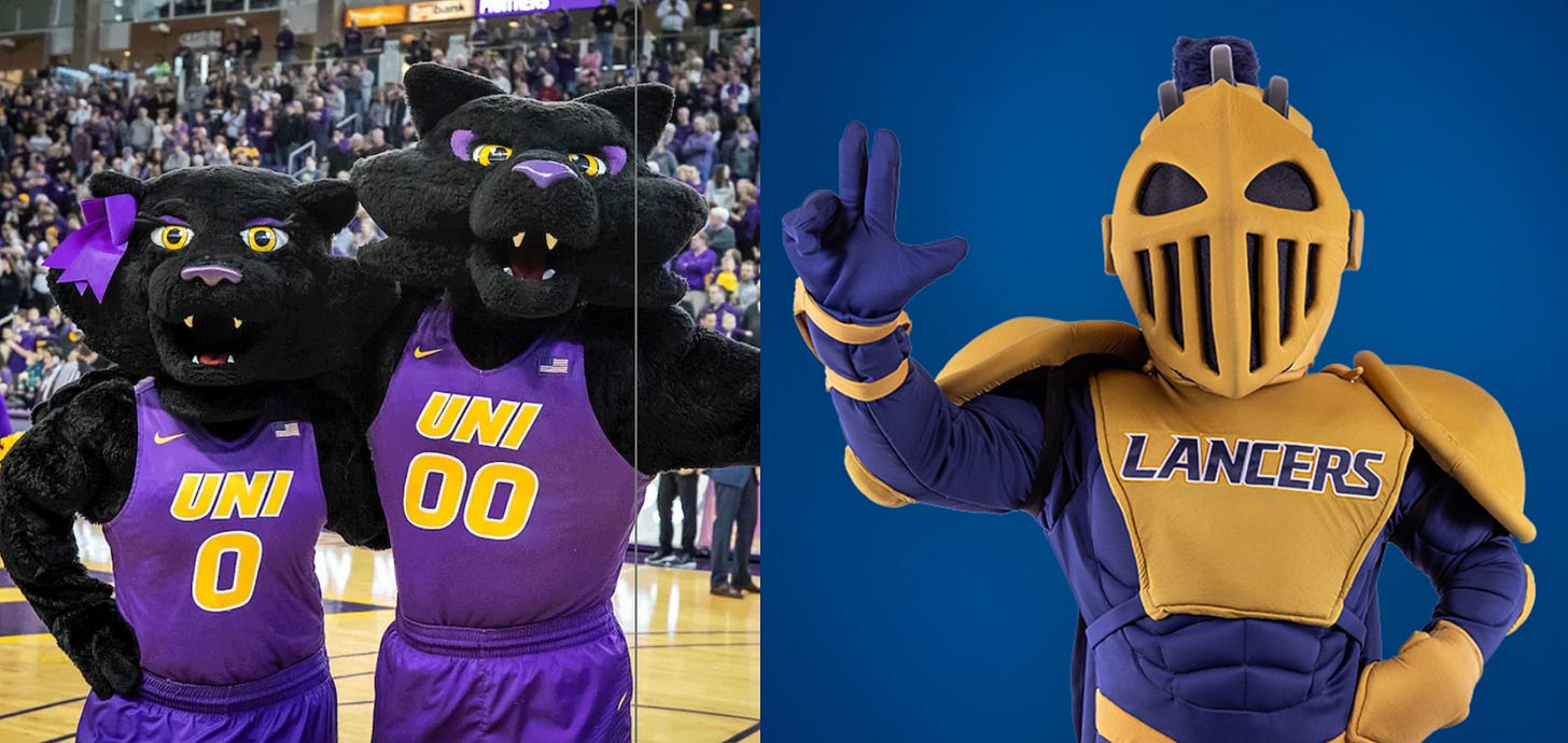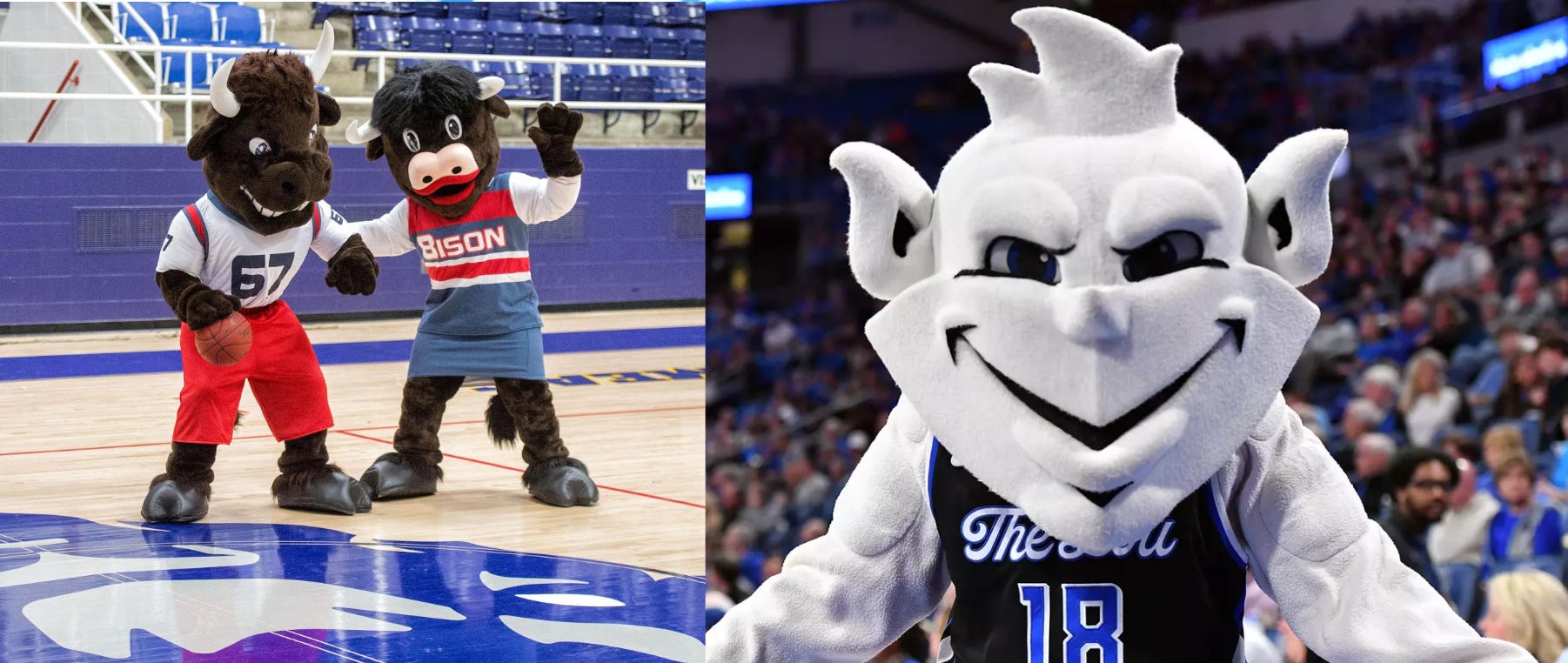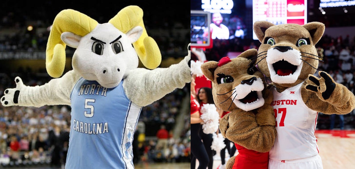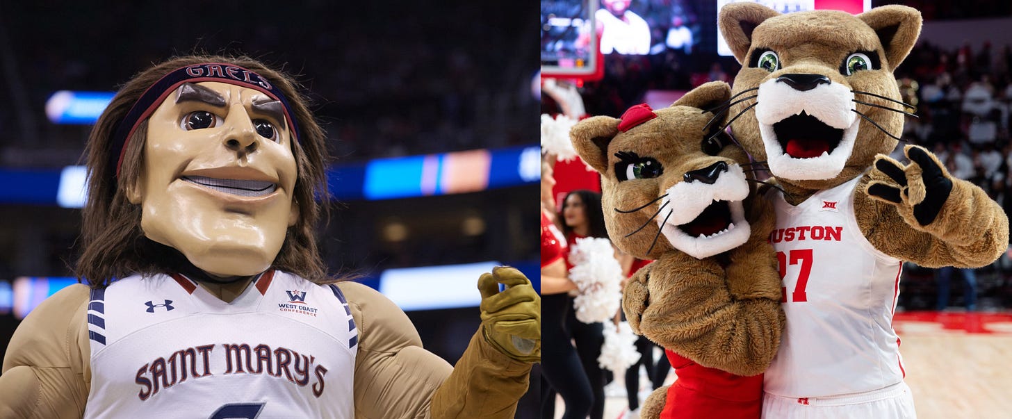 Saint Mary’s mascot is an abomination, looking like what Clavicular is going to look like in 25 years (plastic sheen included). On top of that, the Houston mascots are a pair of cats who look good and are normal-looking mascots.