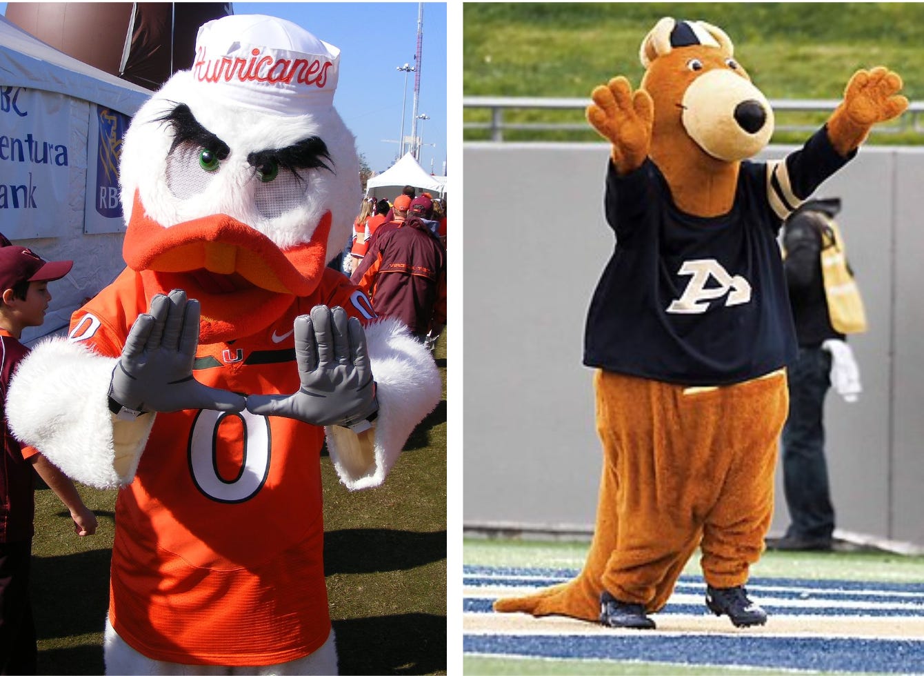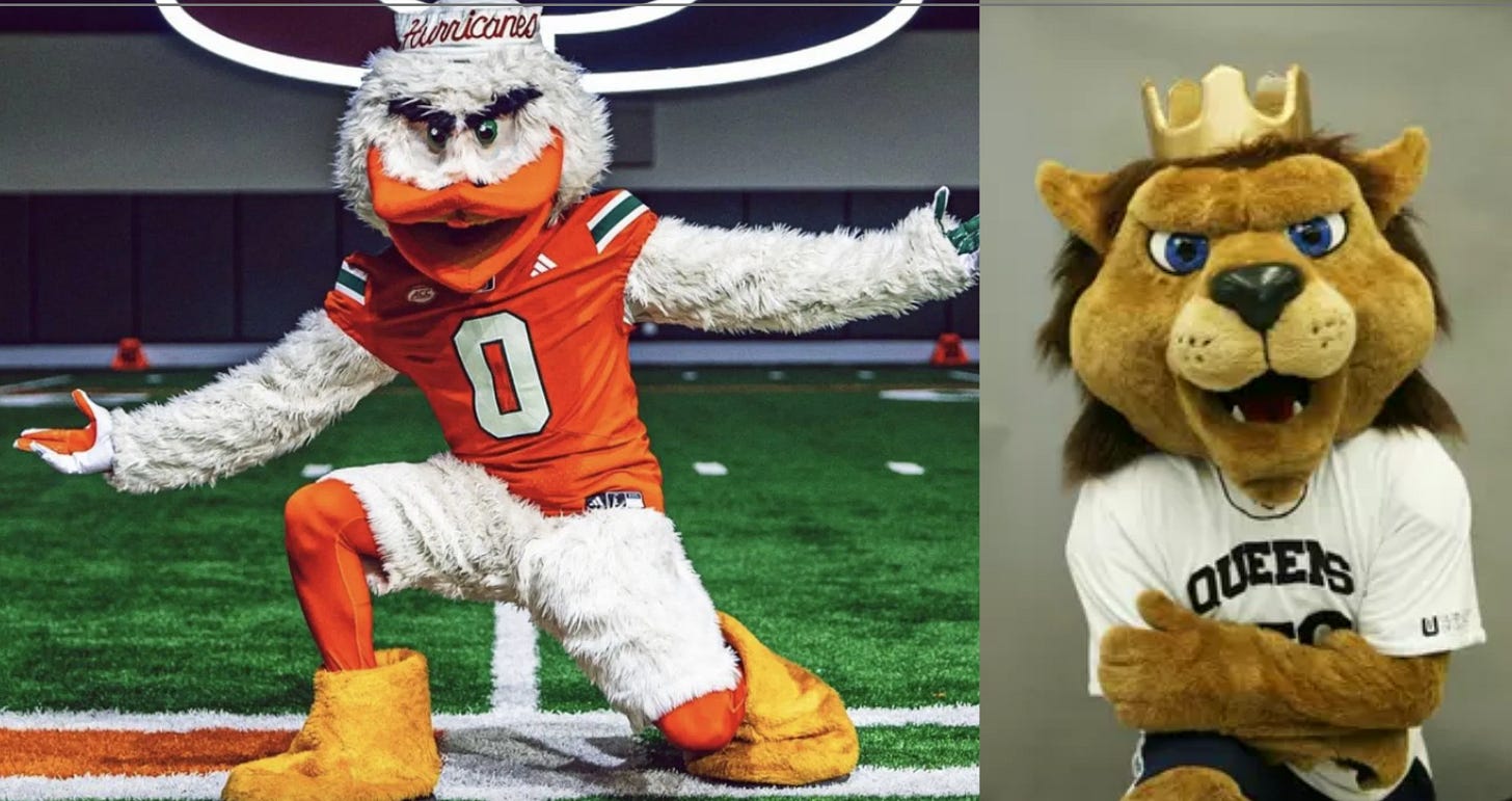 Okay, this is the first real upset of the night. I have so much good to say about both, and it is so difficult to have to pit two bad bitches against each other. Like I am literally crying and throwing up right now (never mind that it’s 12:35am). I fucking love a duck mascot, and Miami’s is so good. He’s got character and swag. He’s also got a little hat. But do you know who has a little hat, too?? OKAY WAIT. I googled the wrong Queens university and the original one I thought was the right one had a bear with a little dapper plaid beret thing, but that school is in CANADA and is the wrong school. The Queens we’re talking about is in North Carolina and its mascot is Rex the Lion. He’s just a lion, and while he would still win round one—because I fucking HATE the Purdue mascot—he’s not gonna make it past this round.