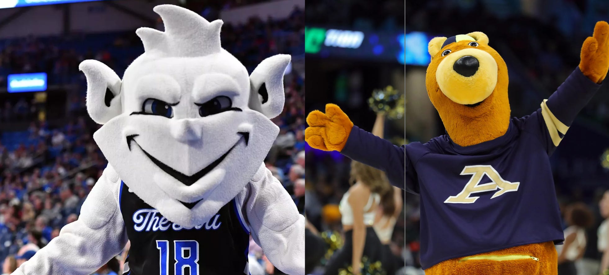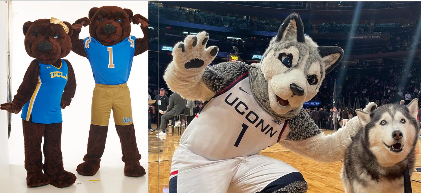 The UConn wolf does look good as far as mascot design goes, but he does look a little too furry-like for my taste. Despite the allegations that nobody is dishing out against me, I’m not super into that kind of Lion King-looking animal, even though I know that Scar was a formative experience for many of my peers. He’s just too manly-looking for my taste, especially when we have a couple of very cute bears on the opposing team. I do have a soft spot for a teddy bear creature, and despite not liking unicorn hunters in real life, in the context of basketball my bisexual ass appreciates when a mascot comes in a pair. They would definitely take care of me.
