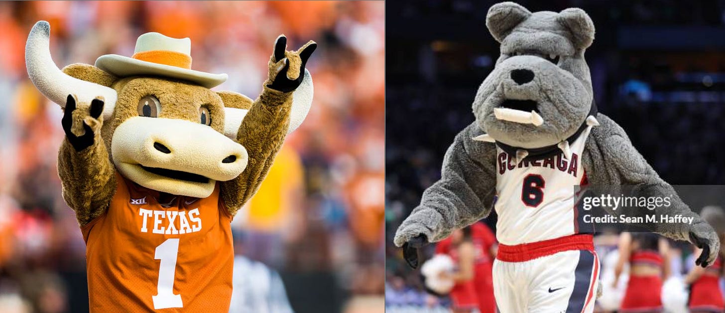 I’m conflicted about this one. The Texas Longhorns’ main mascot is a live animal named Bevo, but as I am googling their mascot, I also see pictures of this little guy and they look modern enough for it to count. On the other team, there is Spike the bulldog representing Gonzaga. His design is fairly exquisite for a school that has a bulldog as a mascot. I have a little bit of disdain for bulldog mascots because my high school also was a bulldog and we had that same shitty clipart as the rest of them. Also, the mascot form of Bevo does have a cute little cowboy hat, which is important to me.