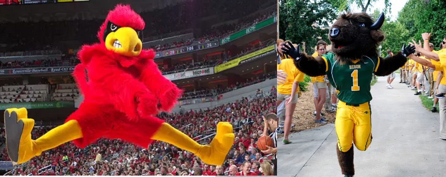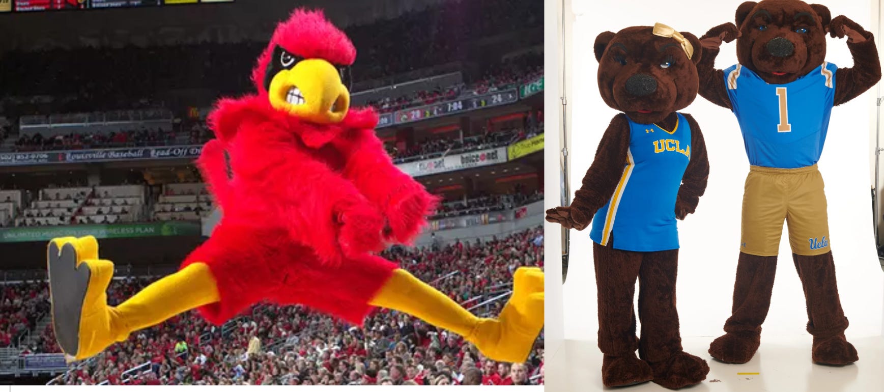When it comes to good mascot design, a major element is the color scheme. As a mascot, as the main source of entertainment on the field/court outside of the players, you really want to stand out. The UCLA bears are cute and their fur pairs well with the light blue of their outfits, but the Louisville bird does a great job standing out with red feathers and an innate ability to do the splits. He’s got a competitive look in his eyes in a way that says, “I can win Renée’s fucked up March Madness bracket.”