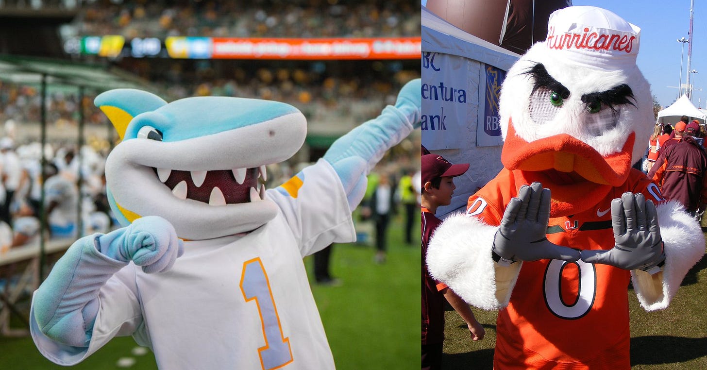 When we get down to the nitty gritty, things get tough for me spiritually. I have had so much praise for both mascots during this whole thing, but now I have to choose a winner when two winners stand before me. The shark guy, despite how cool he is, is just not as cool as a duck. I don’t even think that statement is true, I just have a very strong duck bias. Everyone has flaws—even me. Especially me. Miami’s little sailor hat is going to carry this duck over to the next round.
