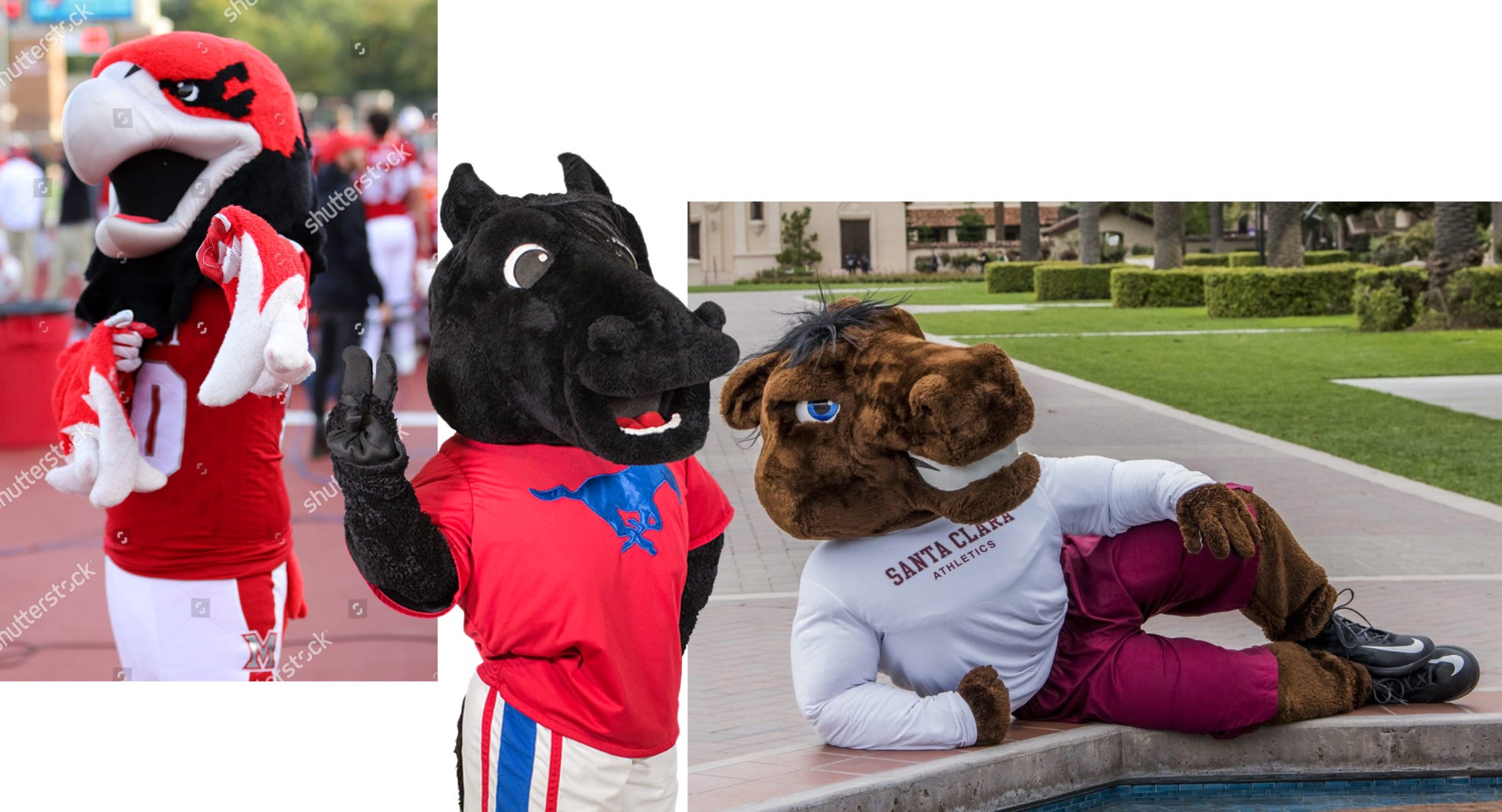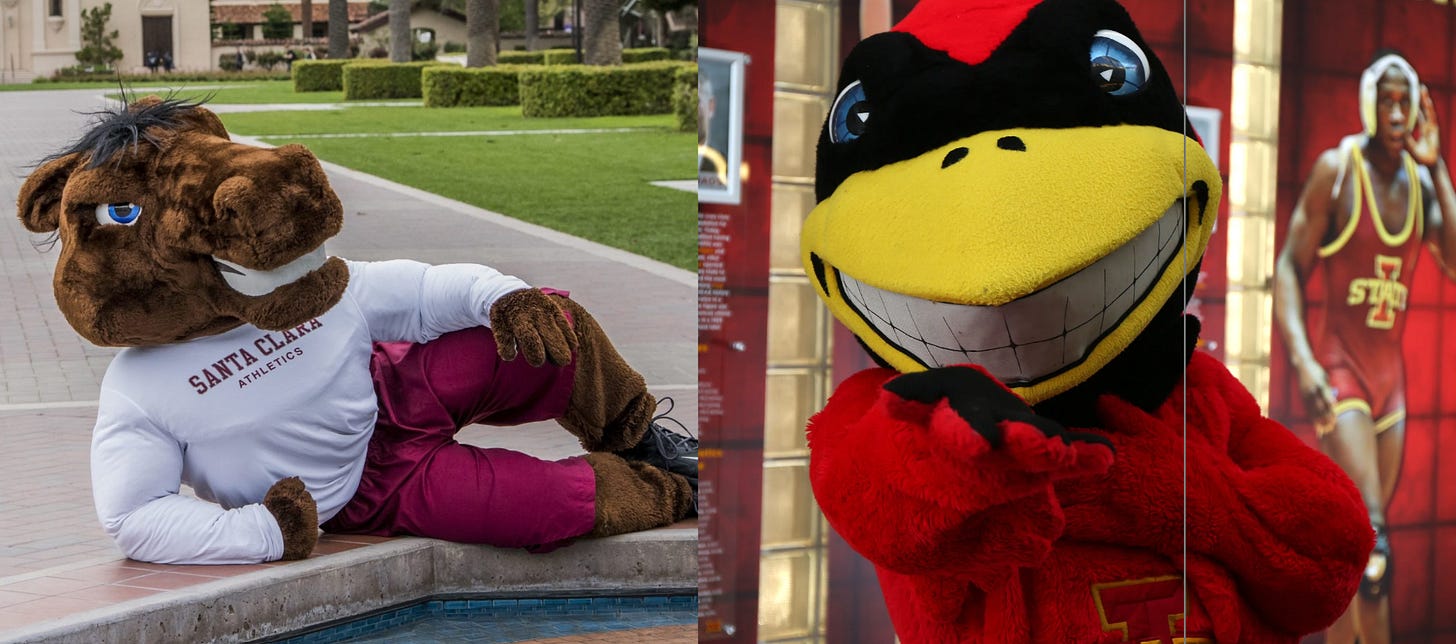 Iowa State is a classic bird, similar to the other Iowa school that people would draw and quarter you for mixing up in conversation. This seems to be a trend where birds initially excite me, but then they seem to fall a little short later on. This is unfortunate, but then there’s Bucky the Bronco of Santa Clara University, who is a buff horse. I’m not saying that this is my type exactly—there are tons of very precise and scientific factors for my decisions—but the way that he’s laying down, sensual but also inviting and casual, means that he wins this time.