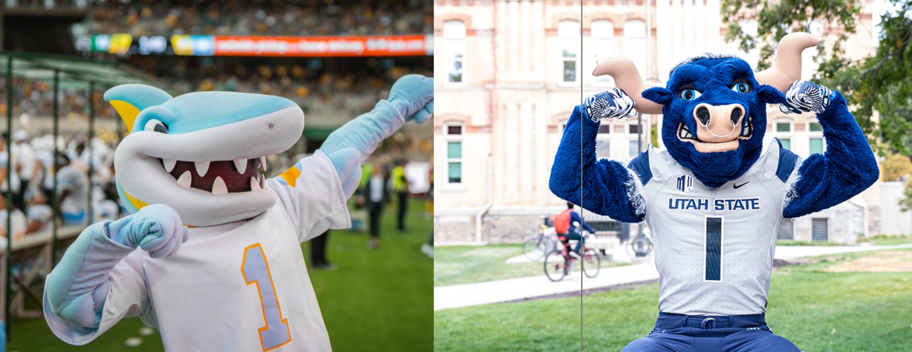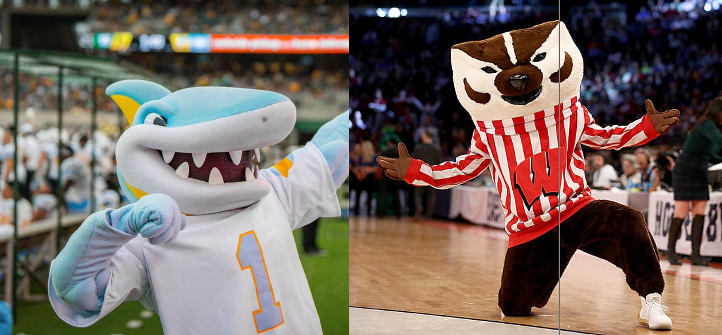 I know I chose to go on this journey together with you, but this shit hurts and I am making myself depressed. I do not want to say goodbye to the Wisconsin badger, but I think I must. When it comes to who is the best mascot, a lot of it comes down to charisma. Bucky Badger’s look is unique and iconic—a popular sign you see around the yards in the Chicagoland area—but is he the most fun out of these two? Unfortunately, a blue shark is going to win the fun competition every time.